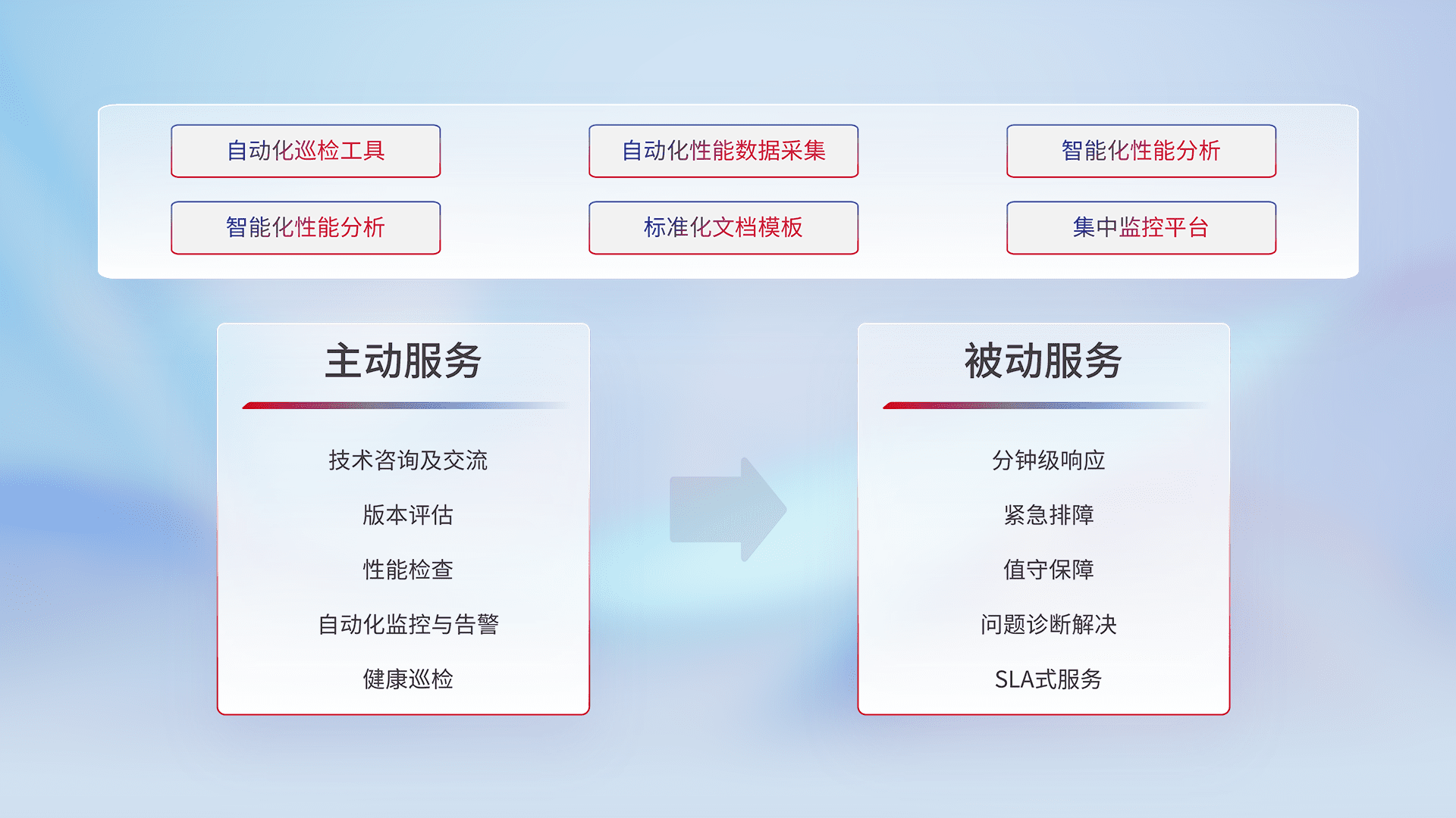 智能化工具和标准化文档,,,保障服务质量,,,提供主动服务(包含技术咨询、、、版本评估、、、性能检查、、、自动化监控与告警、、、、健康巡检)和被动服务包含(分钟级响应、、、紧急排障、、值守保障、、、问题诊断解决、、、、SLA服务)。。。
