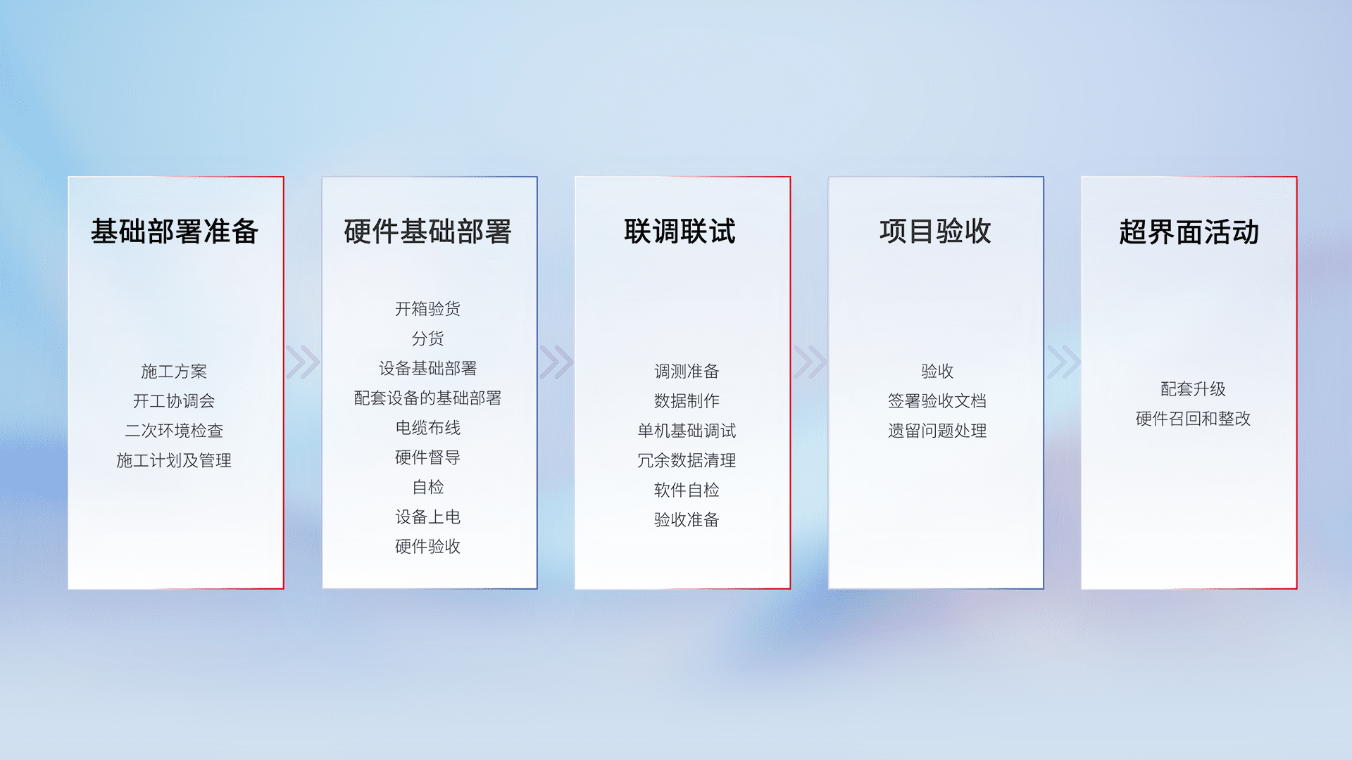 从基础部署准备、、硬件基础部署、、、、联调联试、、、、项目验收、、越界面活动的全过程可追溯,,保证施工质量和进度。。。。